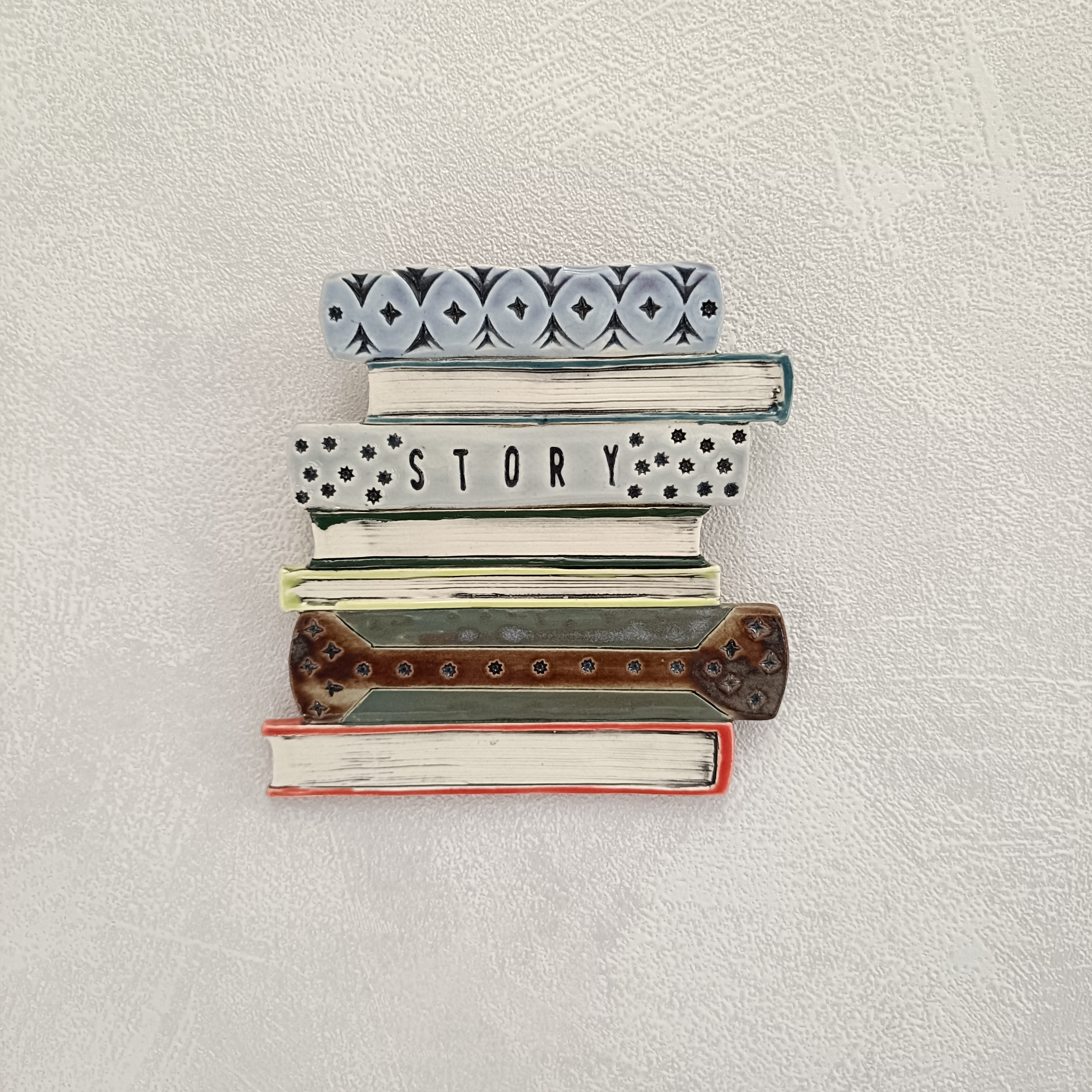 積み上げてる本をモチーフにした壁掛けになります。